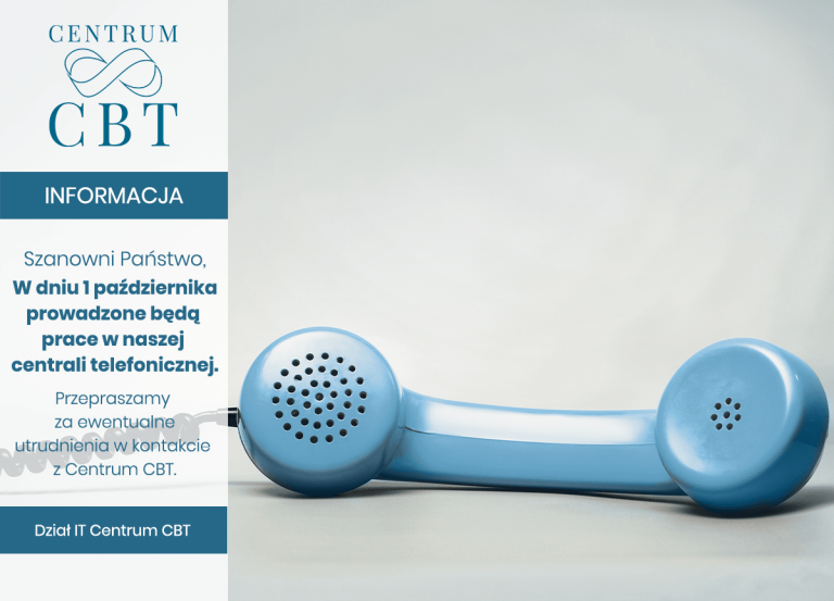 Szanowni Państwo, W dniu 1 października prowadzone będą prace w naszej centrali telefonicznej. Przepraszamy za ewentualne utrudnienia w kontakcie z Centrum CBT. Dział IT Centrum